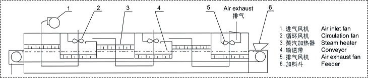 DW系列帶式干燥機料斗中的物料由加料器均勻地鋪在網(wǎng)帶上,網(wǎng)帶采用12-60目不銹鋼絲網(wǎng),由傳動裝置拖動在干燥機內(nèi)移動。干燥段由若干單元組成,每一單元熱風獨立循環(huán),其中部分尾氣由專門排濕風機排出,每一單元排出氣量均有調(diào)節(jié)閥控制。在上循環(huán)單元中,循環(huán)風機出來的風由側(cè)面風道進入單元下腔,氣流向上通過換熱器加熱,并經(jīng)分配器分配后。成噴射流吹向網(wǎng)帶,穿過物料后進入上腔。干燥過程是熱風氣流穿過物料層,完成熱量與質(zhì)量傳達過程。上腔由風管與風機入口相連,大部分氣流體循環(huán),一部分溫度較低含濕量較大的氣體作為廢氣經(jīng)排濕管、調(diào)節(jié)閥、跳濕風機排出。下循環(huán)單元中,循環(huán)風機出來的風先進入上腔,向下經(jīng)換熱器加熱,穿過物料層進入下腔,下腔由側(cè)面風道及回風管與風機入口相連,大部分氣體循環(huán),一部分排出。上下循環(huán)單元根據(jù)用戶需要可靈活配備,單元數(shù)量亦可根據(jù)需要選取。