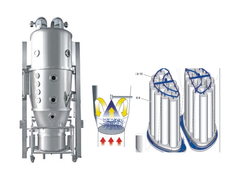 需要制粒的單一或多種粉體原料在沸騰床內(nèi)建立流態(tài)化過(guò)程,同時(shí)混合,粘結(jié)劑經(jīng)特制噴槍霧化噴至流化界面,物料凝聚成粒并干燥,揮發(fā)水份由風(fēng)機(jī)排出。集混合、制粒、干燥多功能于一體,自動(dòng)化程度高,能快速制粒,快速干燥。