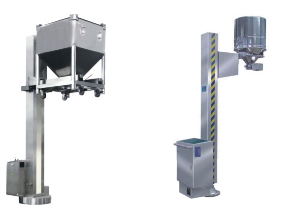 該機由底盤、立柱、提升系統(tǒng)等部件組成。工作時,先將裝有物料的料斗推進料斗提升機的提升叉架上。然后啟動提升按鈕,料斗做提升運動,料斗到位后轉動底盤與加料的設備密閉對接,開啟出料蝶閥,使物料密閉轉移到下一工序。